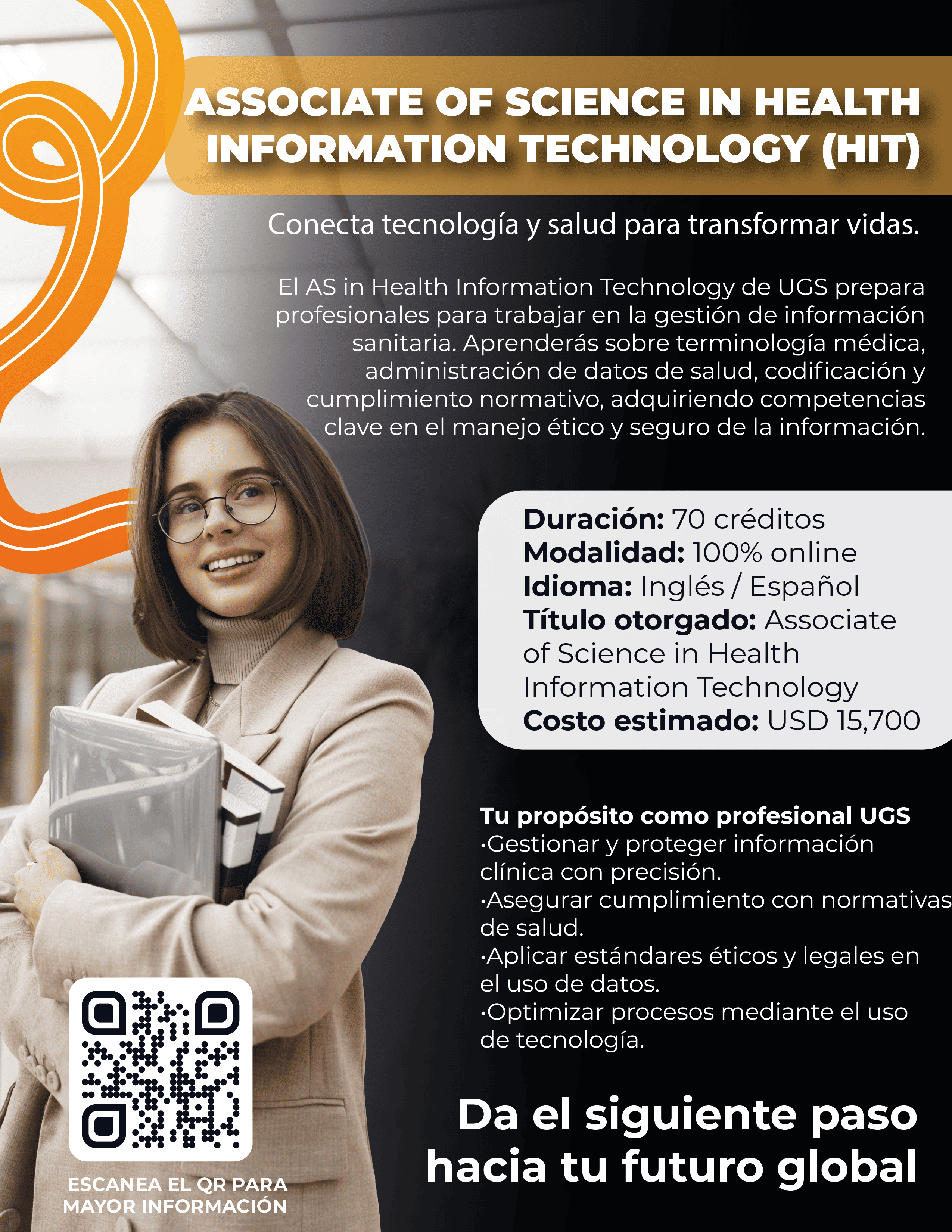 El programa de Health Information Technology (HIT) forma profesionales especializados en la gestión y protección de información médica digital. Su enfoque combina tecnología, salud y normatividad, capacitando a los egresados para administrar sistemas de registros electrónicos y garantizar la confidencialidad de los datos clínicos.